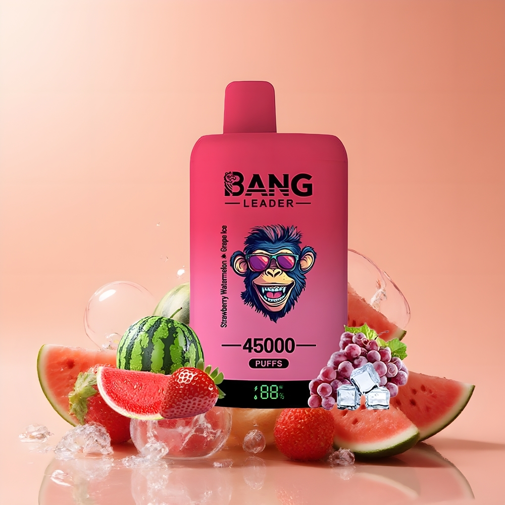 Bang Leader 45000 Puff Eldobható E-szigaret Eper-Görögdinnye-Szőlő Jég + Magyarország Nagyker – 0-5% nikotin, Okos Kijelző, Type-C, Dupla Íz 2-in-1