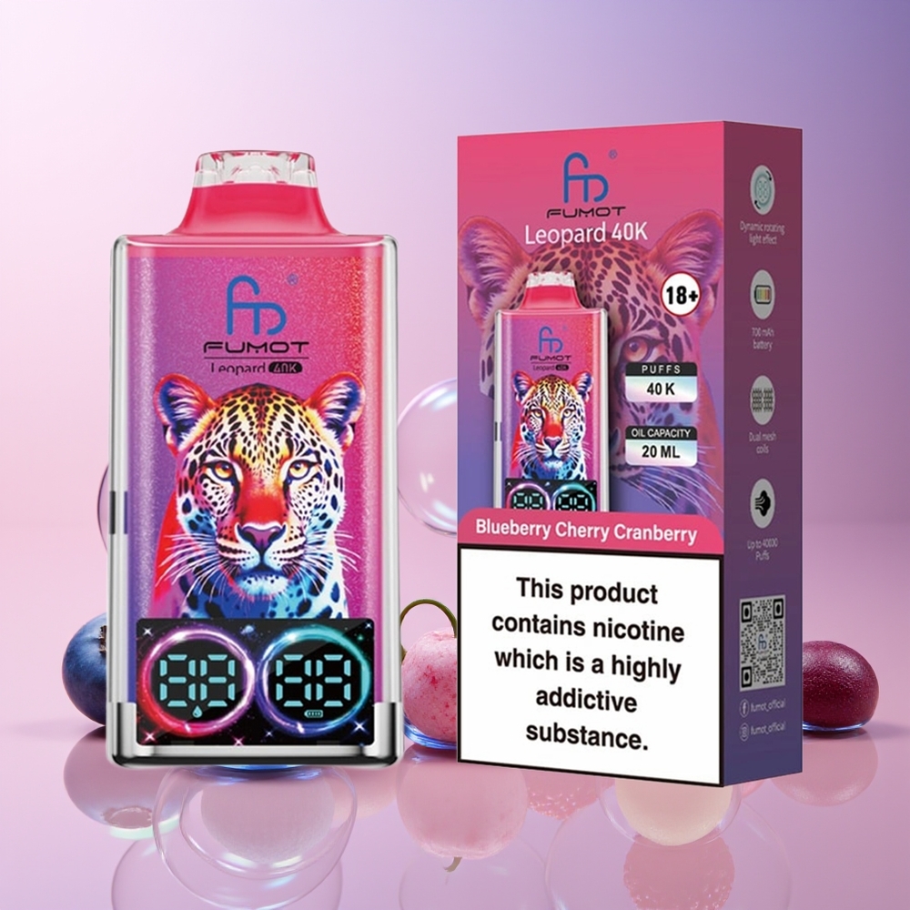 Fumot Leopard 40K Puffs Eldobható E-szig Blueberry Cherry Cranberry (Áfonya-Cseresznye-Városbogyó), 0-5% Nikotin, 700mAh, Dual Mesh, Type-C, Magyarország Nagyker
