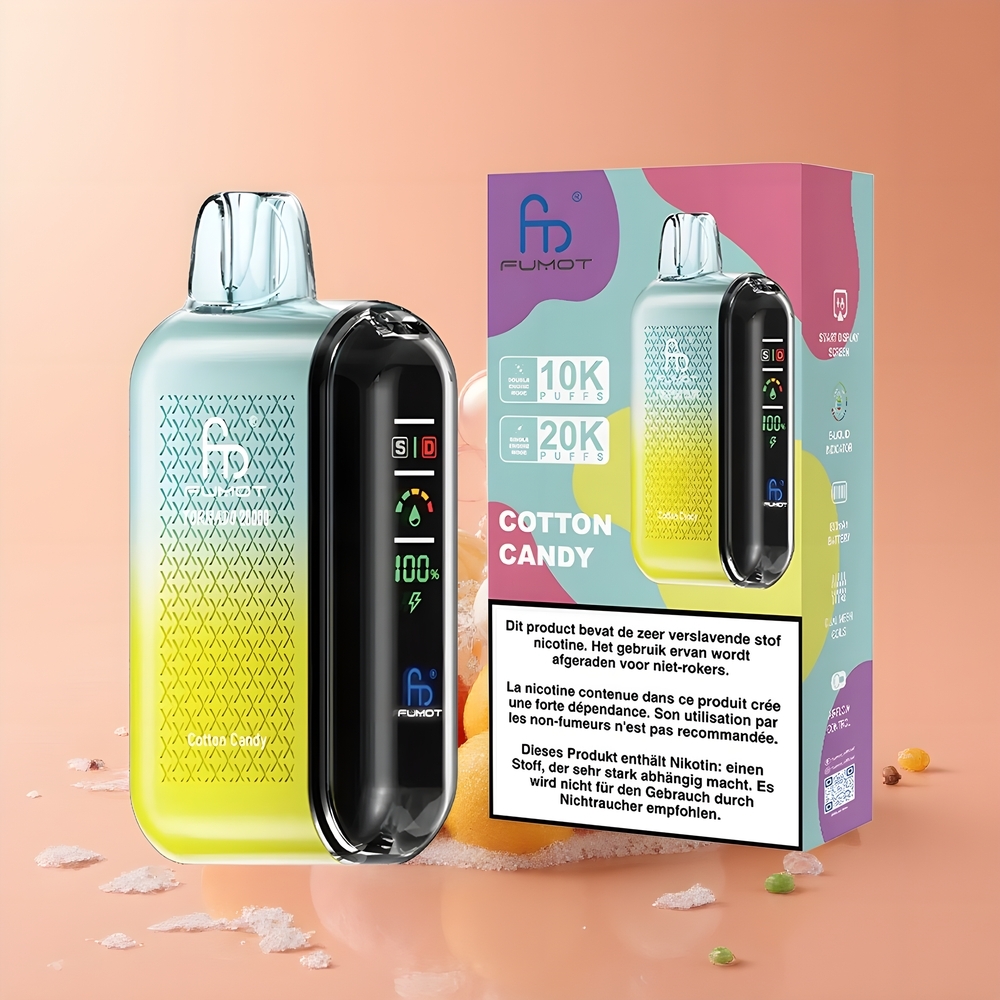 Fumot Tornado 20000 Puffs Eldobható Vape Vattacukor, 20000 Puff, Dupla Mesh Coil, 20ml E-liquid, 850mAh, Okos Kijelző, Magyarország Nagyker
