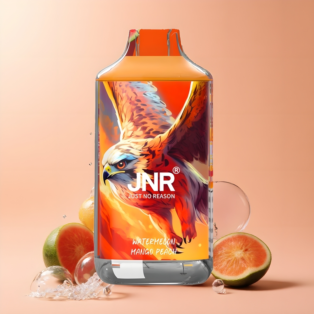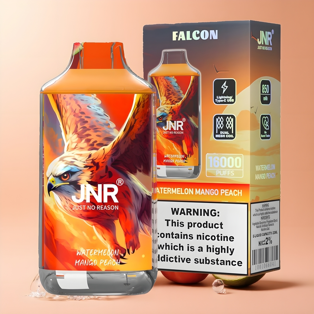 JNR Falcon 16000 Puffs Eldobható E-víziló Görögdinnye Mango Őszibarack, 16000 Puff, 850 mAh, 22ml, Dual Mesh Coil, Type C & Lightning, Smart LED, 0%,2%, Magyarország Nagyker