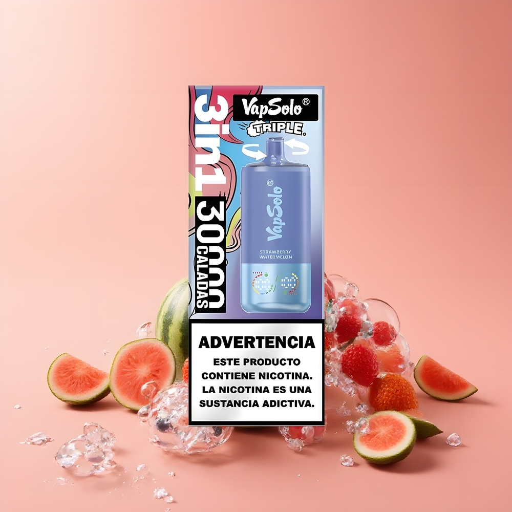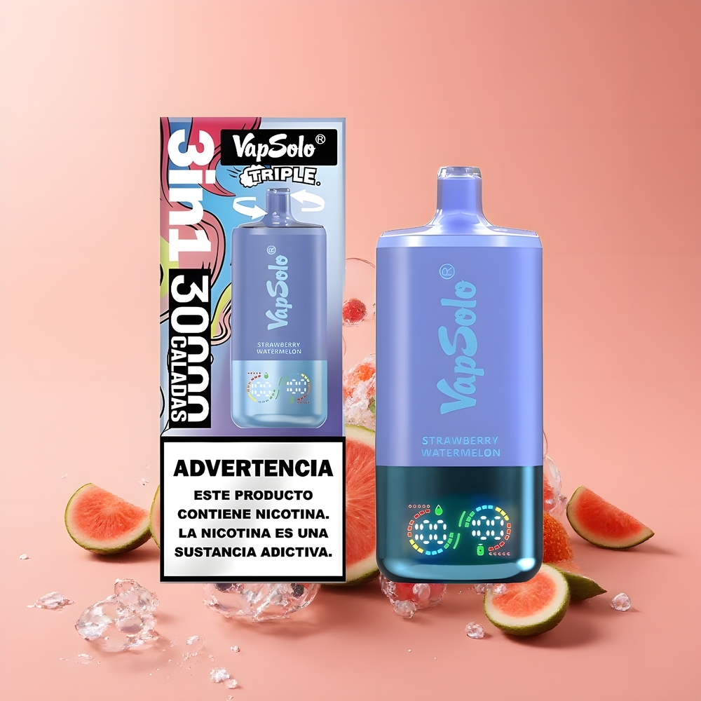 VapSolo Tripe 30000 Puffs Eldobható E-pipa Eper-Görögdinnye & Áfonya Jég, 40ml, 20/50 mg/ml, 3 tartály, Type-C, Magyarország Nagyker